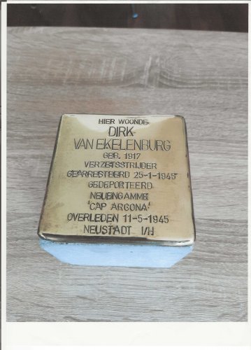 Dirk van Ekelenburg werd in 1917 geboren als oudste zoon van Johannes van Ekelenburg en Jacoba van Roon. Op 19 jarige leeftijd ging hij naar leiden om daar Theologie te gaan studeren aan de universiteit. Later werd dat de Zendingshogeschool in Oegstgeest. Daar werd hij voorbereidt voor uitzending als zendeling naar Celebes. Door de oorlogsdreiging in Nederlandsch Indië ging dat niet door. In 1941 werd hij benoemd als Hulp predikant in het Drentse Nieuw-Amsterdam. Doordat hij zijn fiets mocht behouden kwam hij veel bij de boeren inde omliggende veendorpen. Al gauw werd hem door het plaatselijke verzet gevraagd eens navraag te doen voor adressen om onderduikers en Franse krijgsgevangenen uit de, direct over de grens liggende Moorkampen, onder te brengen. Later kwamen daar Joodse medeburgers bij. Dank zij o.a. zijn inspanning hebben velen de oorlog overleeft. In 1944 staat hij aan de basis van een illegale krant, Luctor et Emergo, die hij in samenwerking met de plaatselijke boekhandelaar uitgeeft. Het krantje vind gretig aftrek in bijna heel Zuid-Oost Drenthe. Vlak voor kerst 1944 krijgt hij de mededeling dat hij moet onderduiken want de NSB is hem op het spoor. Hij, en nog een aantal andere verzetsmensen, vinden een plekje in een bejaarden oord in het nabijgelegen Schoonoord. Helaas, door verraad, worden zij daar, op 25 januari 1945, door de landwacht gearresteerd en naar de gevangenis in Assen gebracht. Dirk heeft een paar dagen samen met de schrijver Anne de Vries in een cel verbleven. Op 19 maart wordt hij, via Groningen, samen met het laatste transport uit Amersfoort op de trein gezet richting Neuengamme. Op 29 April vertrekt er een transport richting Lübeck en komt hij op de Athen terecht die een pendeldienst vaar met gevangenen richting de Cap Arcona. Op 2 mei vaart de Athen terug naar de haven van Neustadt met een groep gevangenen welke van de Cap Arcona zijn afgezet. De op dat moment rollen de eerste Britse tanks Neustadt binnen en worden de opvarende van de Athen bevrijd (?). Dirk komt in het Landeskrankenhaus terecht waar hij, ondanks de goede verzorging op 11 mei 1945 op 28 jarige leeftijd toch overlijd aan de verschrikkelijke ontberingen van het kamp en het afschuwelijke verblijf op de Athen. Hij laat een vrouw en twee jonge kinderen achter.
